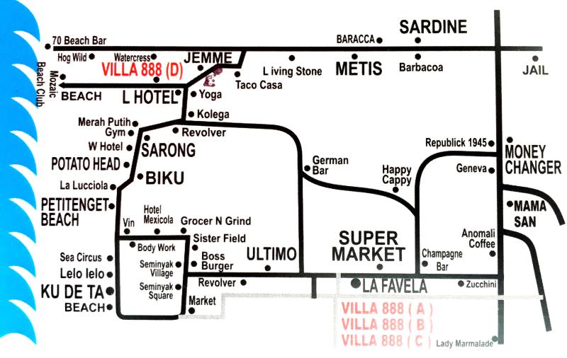 VILLA 888 DUA (C) is located in the heart of SEMINYAK / OBEROI with an pretty 7 min walk to the beach and Ku De Ta, and 200meters from Seminyak’s boutiques and cafes and bars.