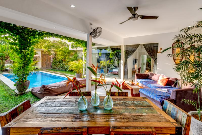 As you walk into the villa you walk through the lush gardens past the pool and snubbing areas into a large open lounge and dining room which is adjoins a large fully equipped kitchen and bar area.